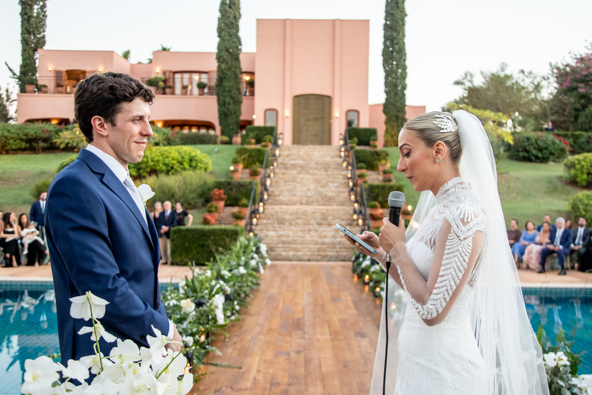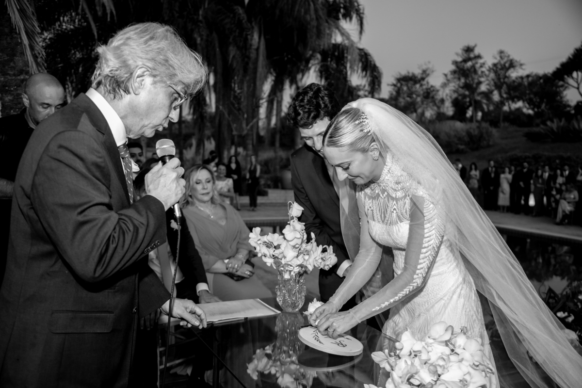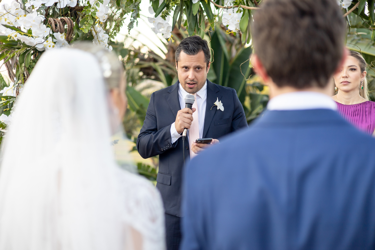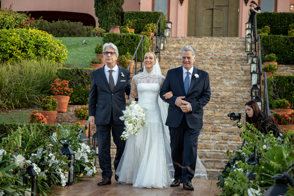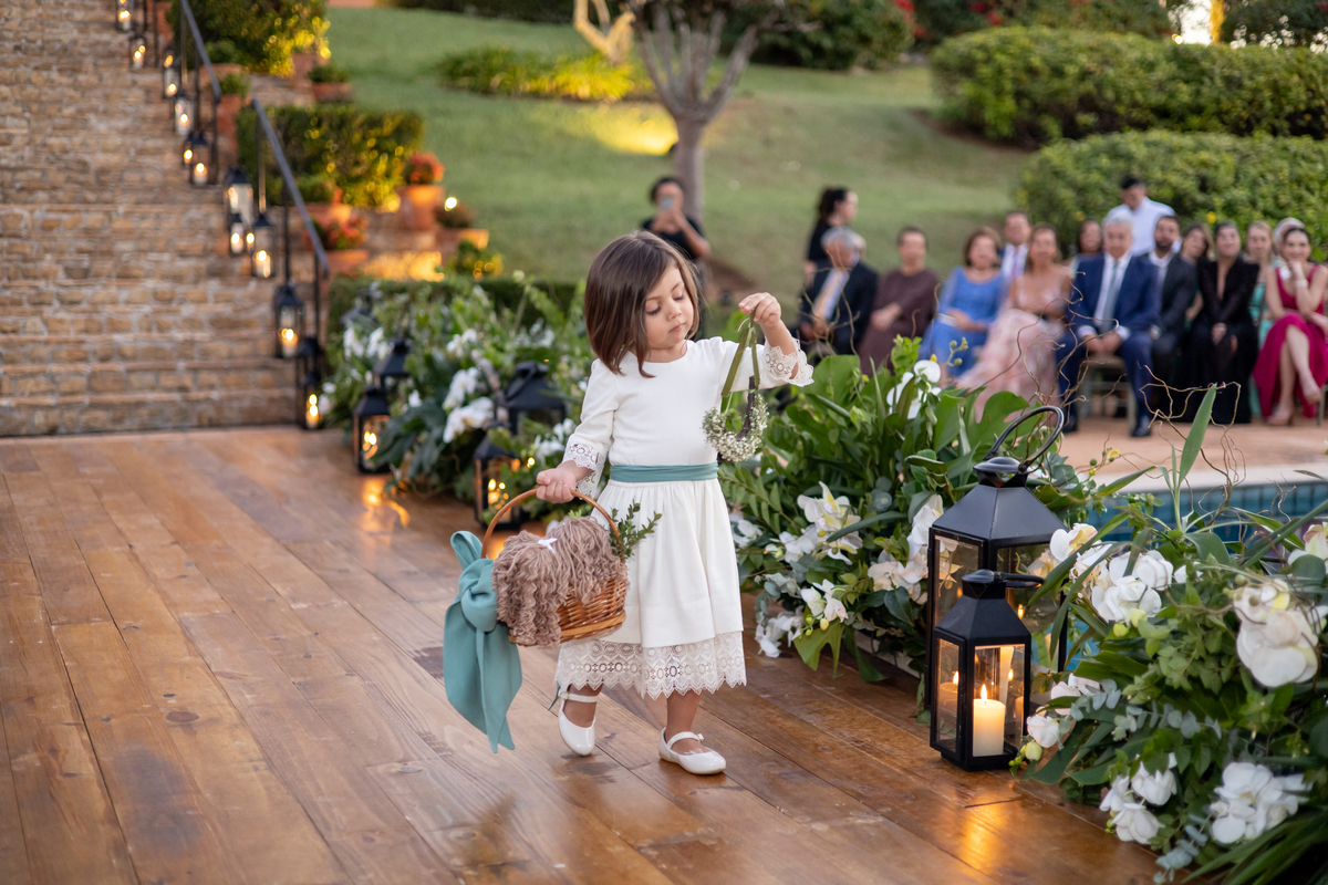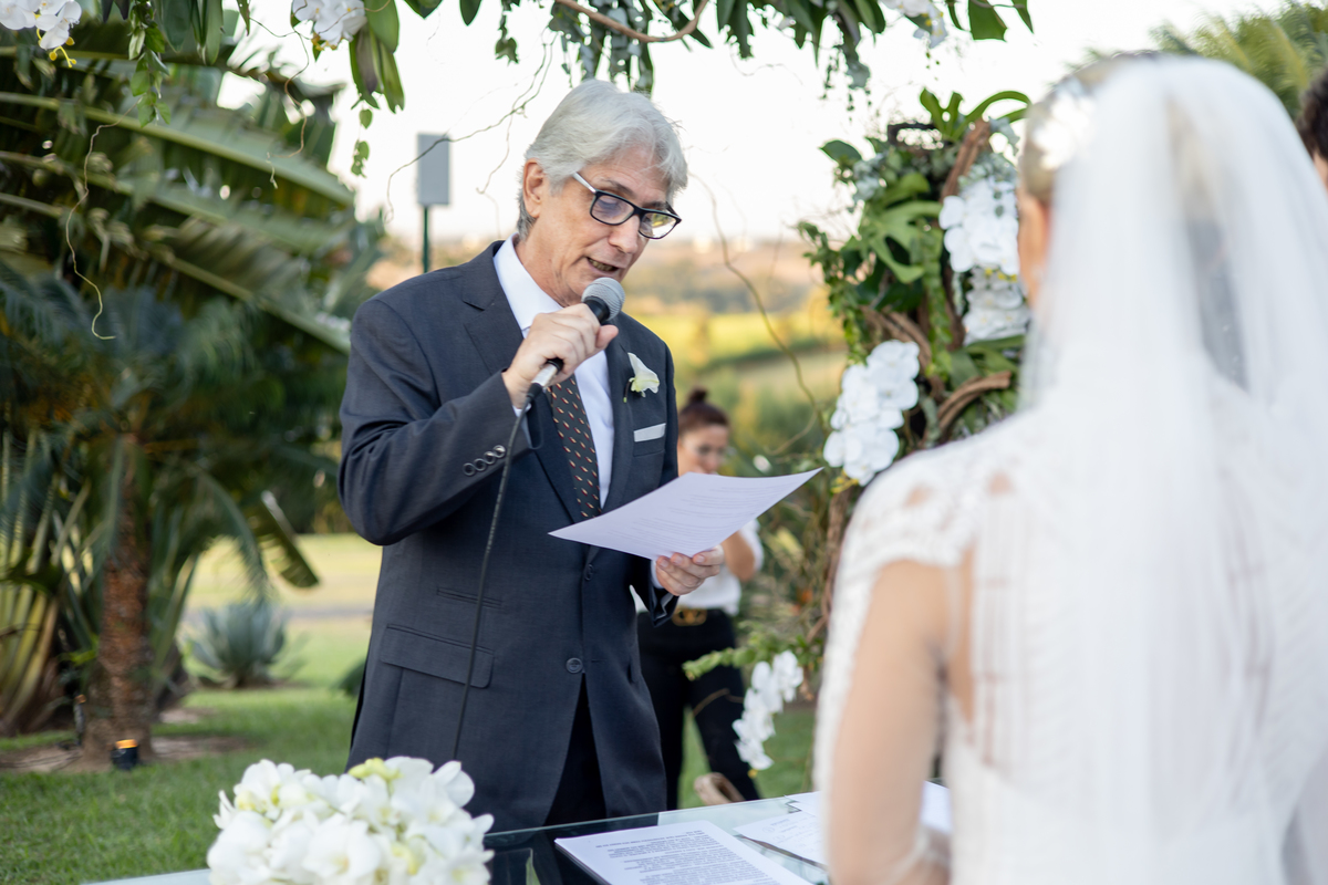 Enquanto o sol lentamente mergulha no horizonte, pintando o céu com tonalidades de laranja, rosa e roxo, Julia caminha em direção ao altar, irradiando uma mistura de nervosismo e felicidade. Rafa, seu sorriso iluminando seu rosto, a espera com olhos cheios de admiração e amor. Amigos e familiares testemunham esse momento especial, cercados pela atmosfera tranquila e serena que só o crepúsculo pode proporcionar.