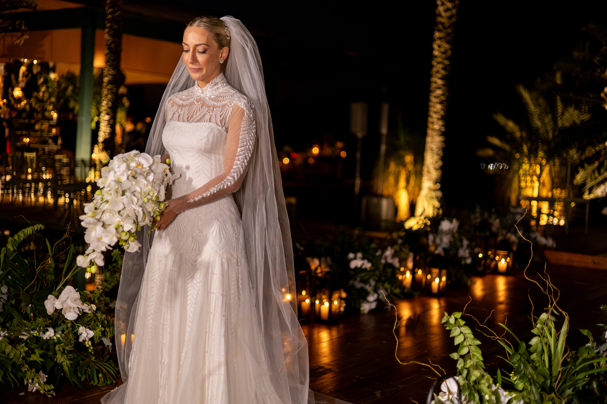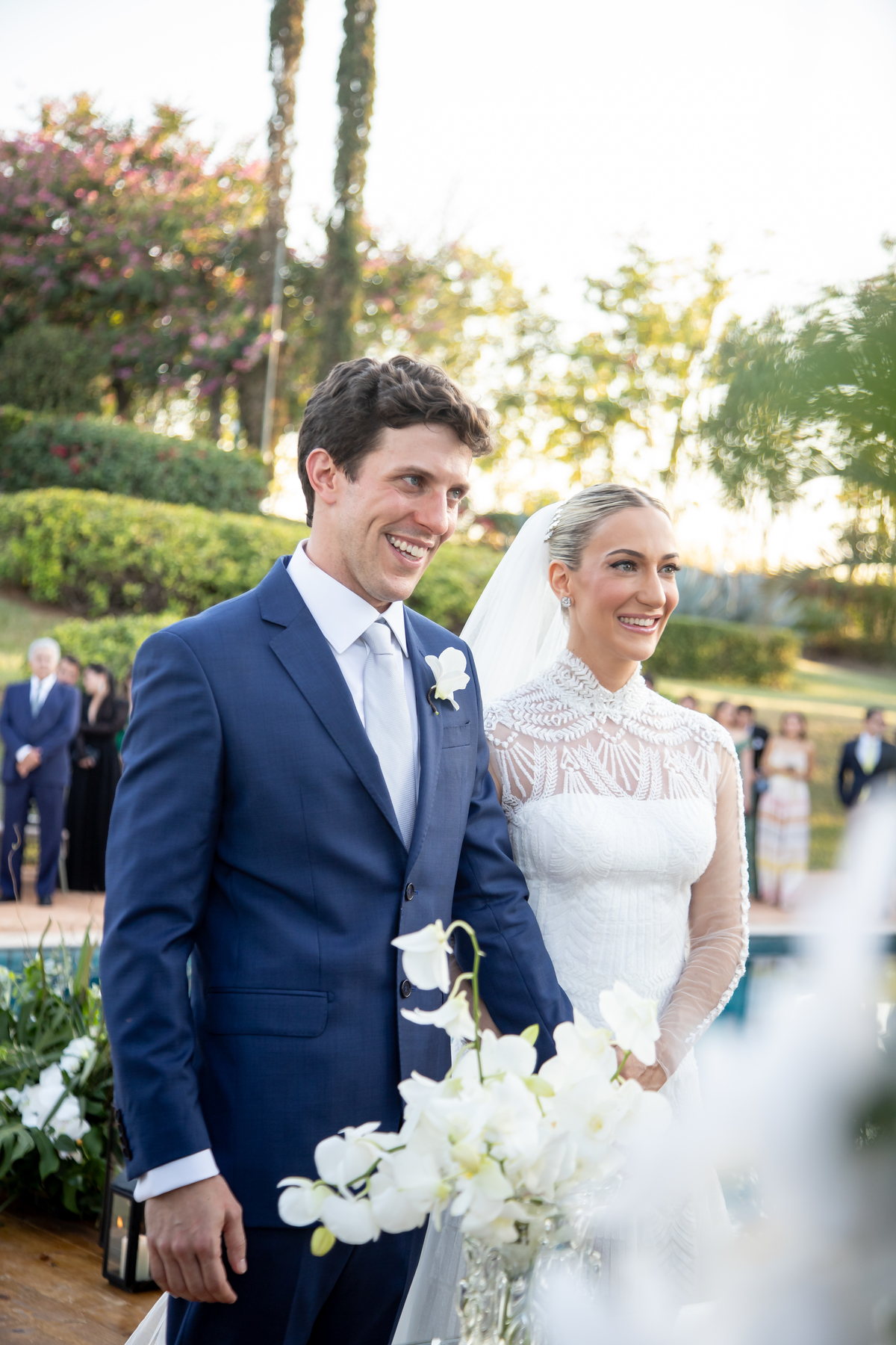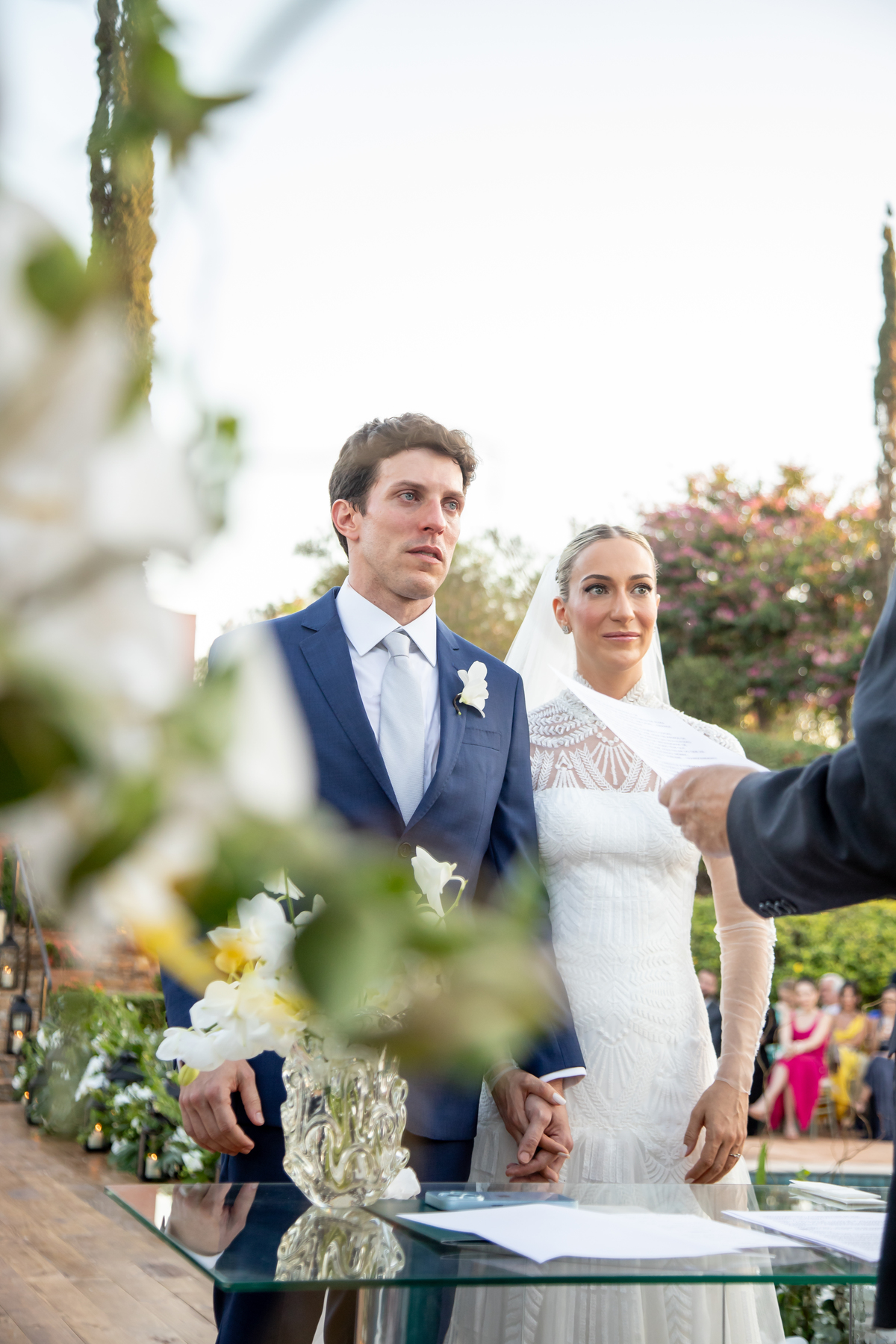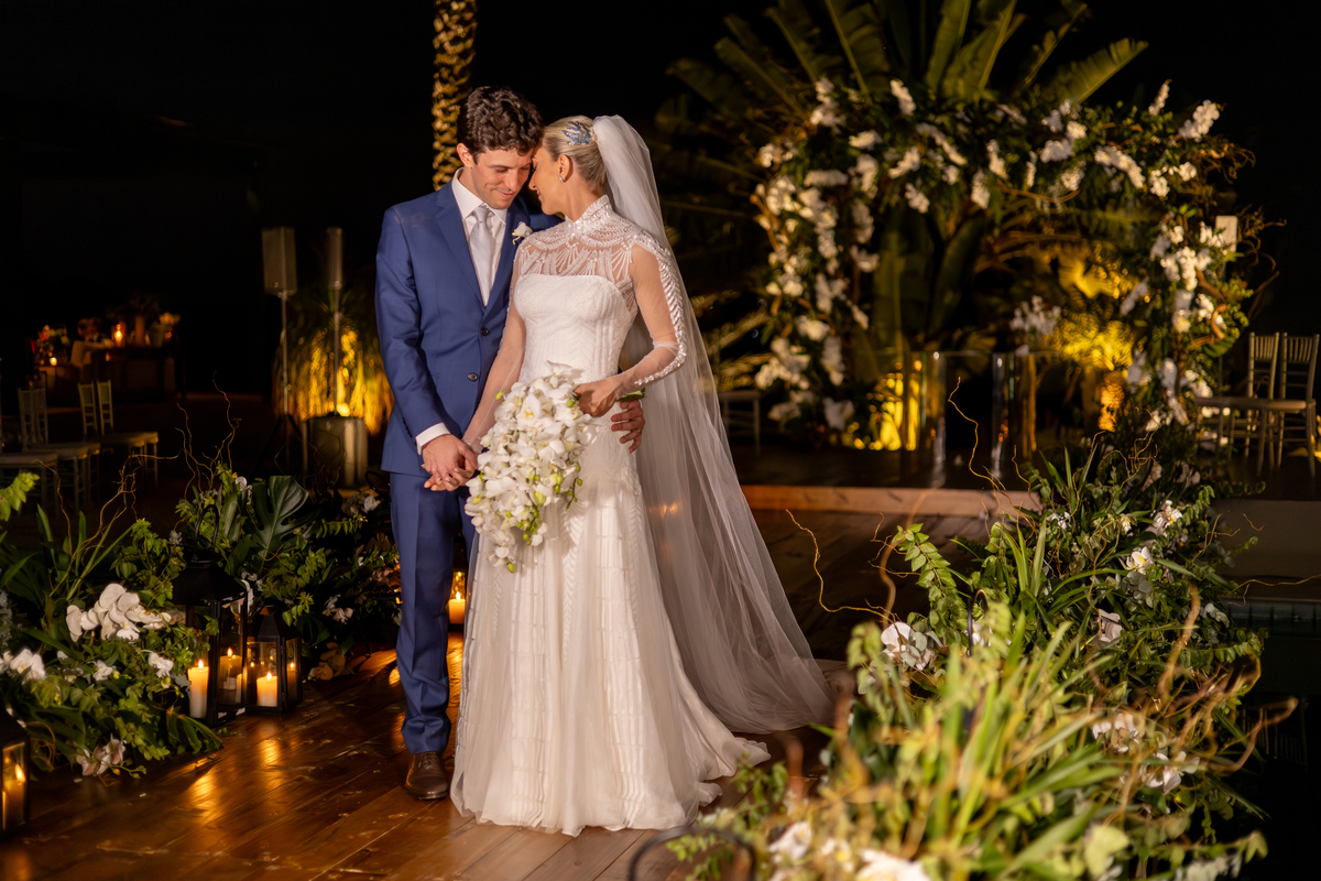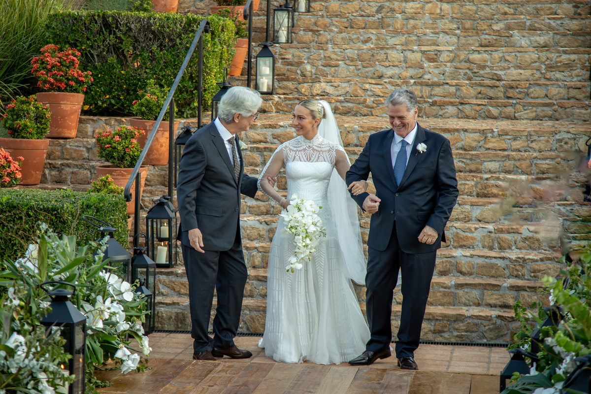 Enquanto o sol lentamente mergulha no horizonte, pintando o céu com tonalidades de laranja, rosa e roxo, Julia caminha em direção ao altar, irradiando uma mistura de nervosismo e felicidade. Rafa, seu sorriso iluminando seu rosto, a espera com olhos cheios de admiração e amor. Amigos e familiares testemunham esse momento especial, cercados pela atmosfera tranquila e serena que só o crepúsculo pode proporcionar.